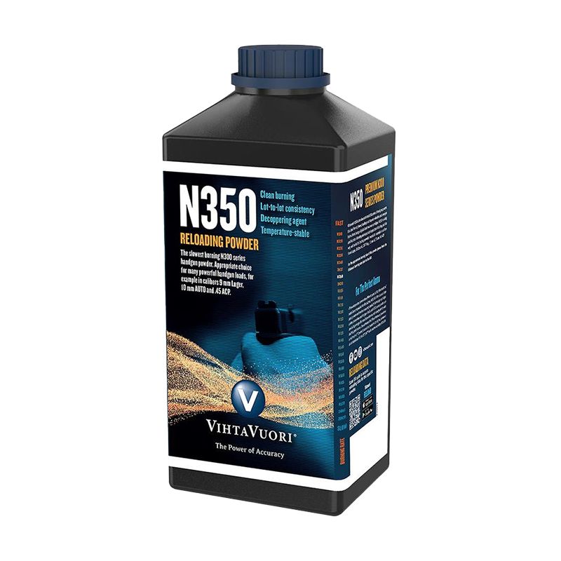 As the burning speed of N350 is at the slow end of their handgun powders, it is ideal for very heavy and top end velocities and energies for a broad range of pistol and revolver cartridges. N350 is widely used in pistol shooting and especially in practical shooting. N350 works excellent also in shotgun shooting with heavy hunting loads, especially with 36 gr loads or more. Stay tuned for shotgun reloading data in the future